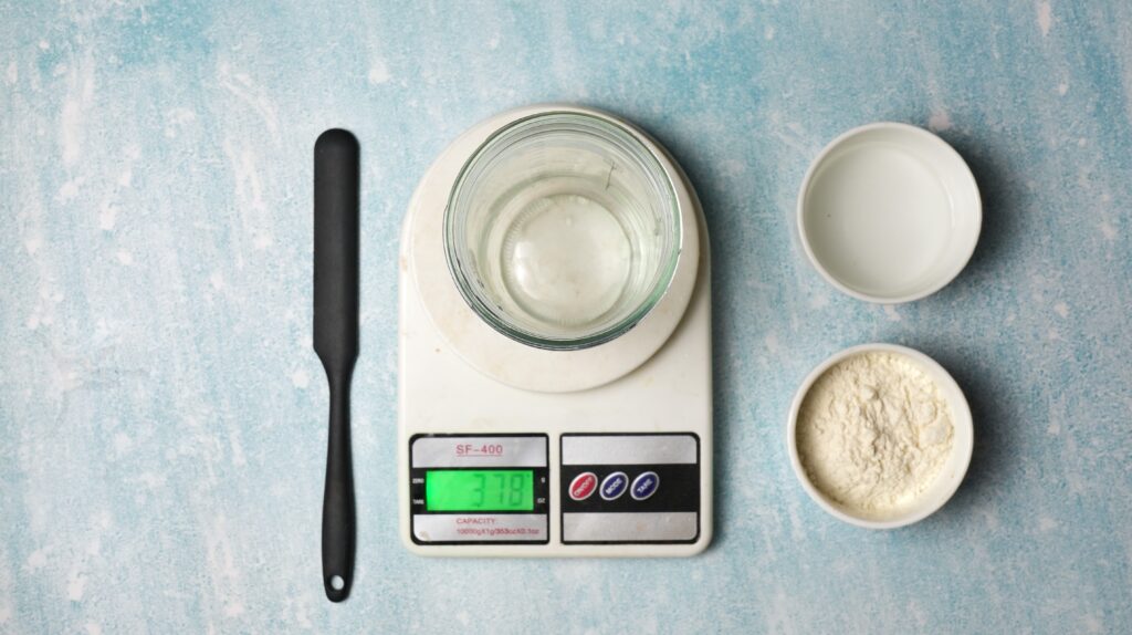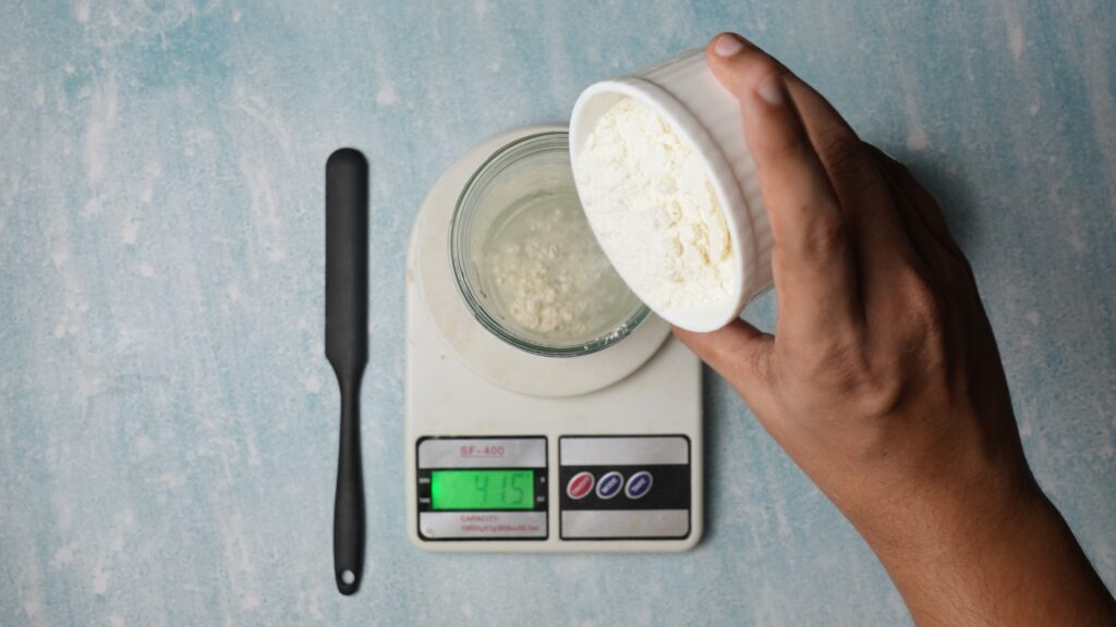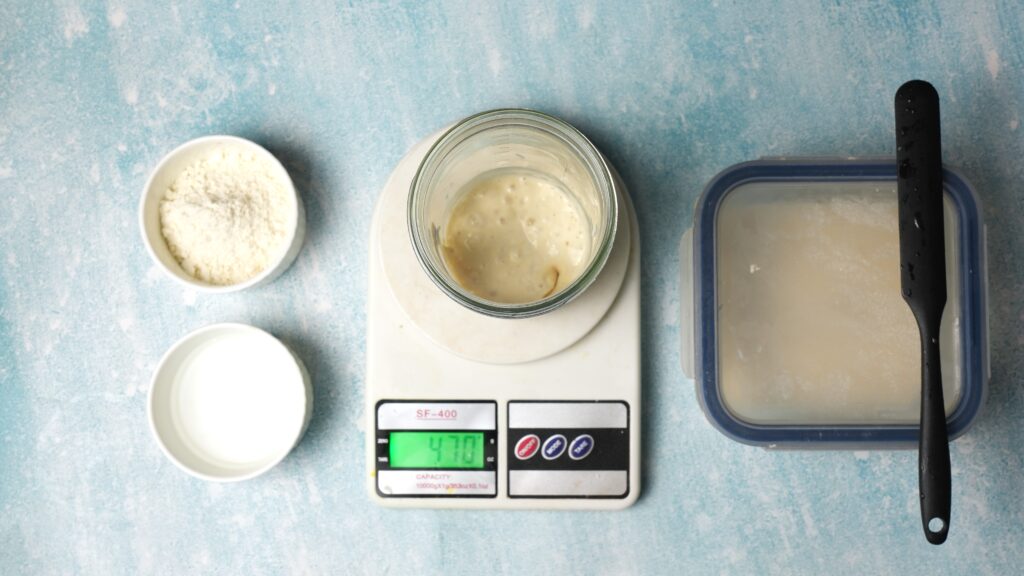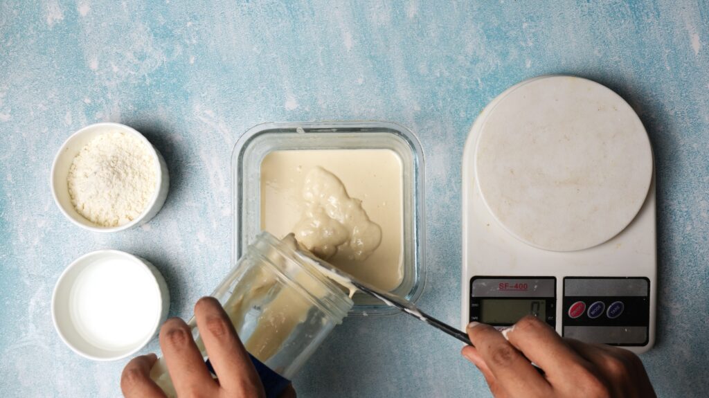 (Next day) Second & for continuous feedings: 20 gms of Starter + 40 gms of water + 40 gms of flour