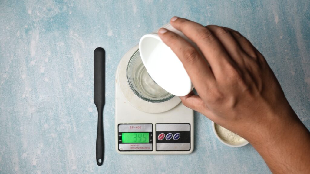 6.) Next Day: Measure the jar again. Discard 80 gms of starter.