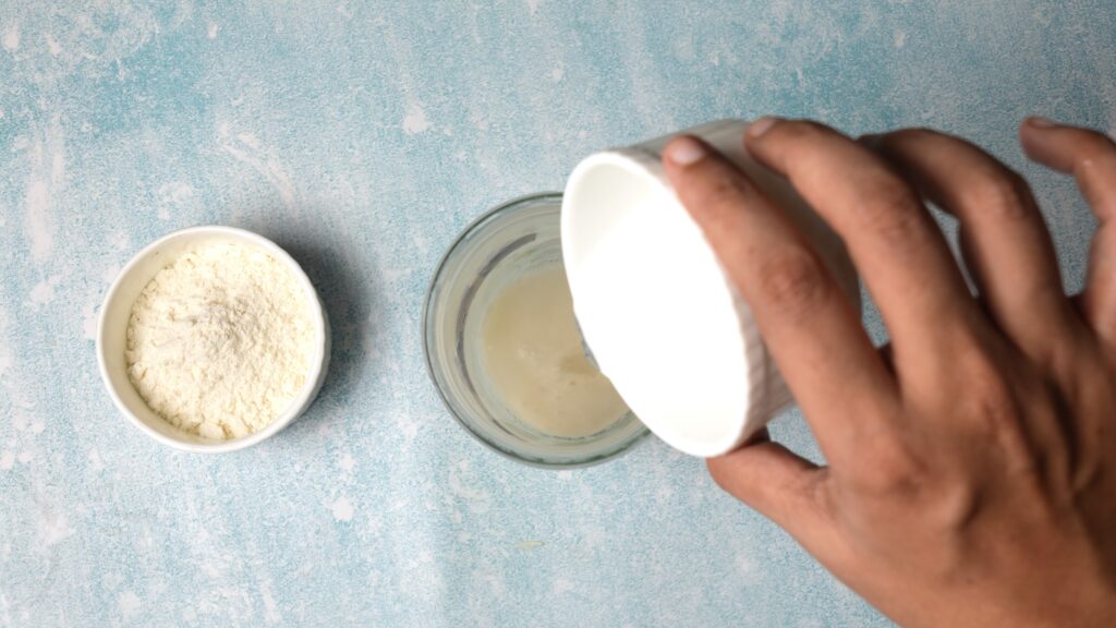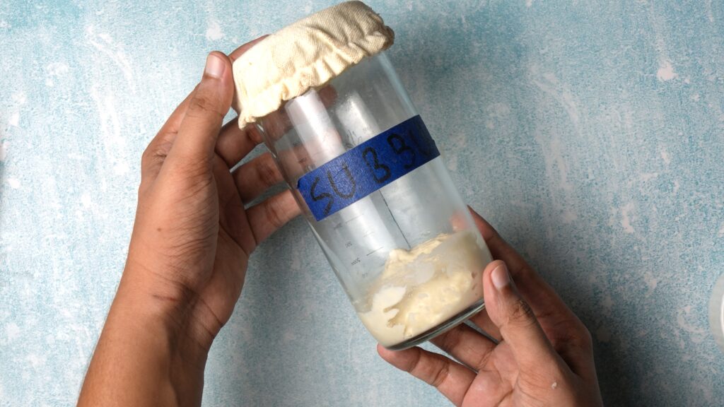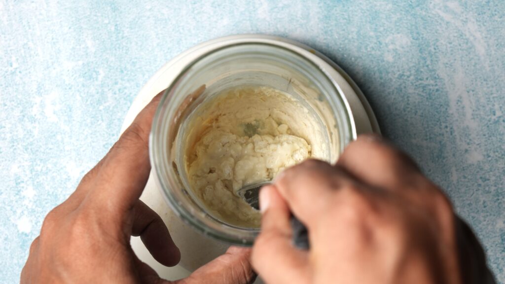 8.) Now, add 40 gms of water to the starter in the jar & mix well.